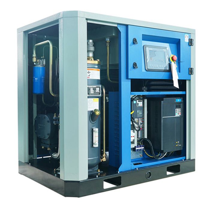- Posee un Controlador PLC inteligente con pantalla táctil que simplifica la configuración de parámetros de múltiples condiciones de operación, protecciones y alarmas, registrando y controlando el estado del Compresor de Aire de Alta Eficiencia.