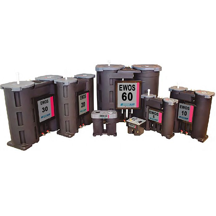 La gama de Separadores Agua / Aceite EWOS permite una separación eficiente del aceite emulsionado presente en las líneas de purga y drenaje de los condensados generados en los sistemas de producción de Aire Comprimido, cumpliendo con todas las regulaciones medioambientales relacionadas con la descarga de aguas residuales contaminadas con aceites y lubricantes emulsionados.